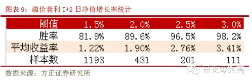 2012年以来整体折价套利数据统计,套利带来丰厚收益。以2%阈值为例,单笔套利的胜率达89.6%,平均收益率为1.90%。