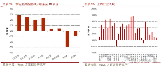 上周指数小幅上涨,创业板在周一大跌4.67%后有所反弹。国债期货小幅上涨,分级A大幅下挫近3%。行业板块方面,多数所有版块都有不同程度的上涨,食品饮料表现最优。