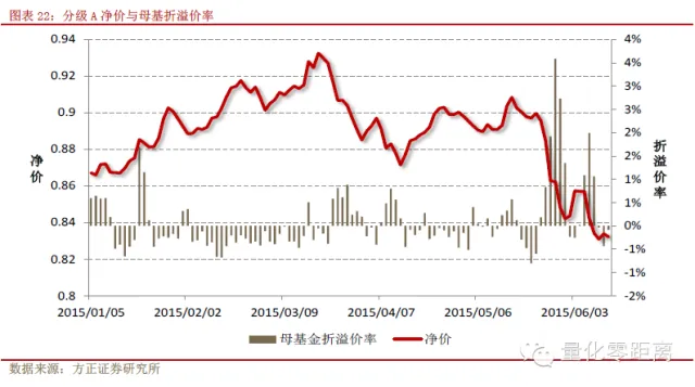 分级A的价格容易受到套利资金的影响,关注相关产品折溢价对于研判A的短期涨跌幅意义重大。当溢价过大时,套利资金入场进行溢价套利,申购母基金后拆分成A、B份额分别卖出,这一过程会打压A类的价格,造成对A类的错杀;反之当折价时会有大量B类持有者选择买入A配对转换赎回,拉升A的价格。