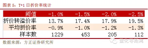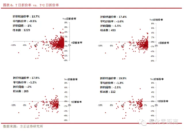 由图表6也可看出,T+1日绝大部分折价率位于小于0的区间。此外,随着阈值的增加,虽然T+1日折价转溢价概率有所上升,但平均折价率仍然很高。
