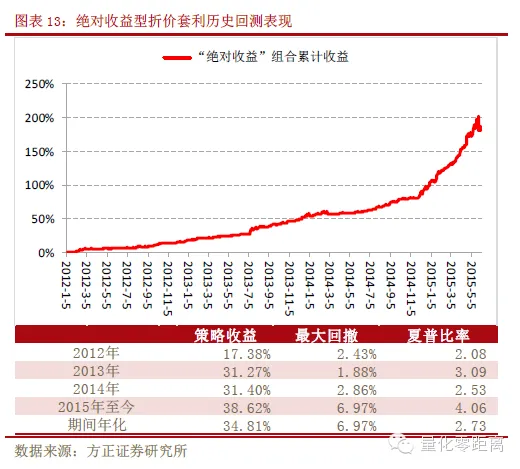 绝对收益型策略:在出现套利机会后买入合并赎回,除了2012年上市分级基金数量较少外,历年策略的收益均高于30%,收益处于相当稳定的水平,夏普比率达2.03。